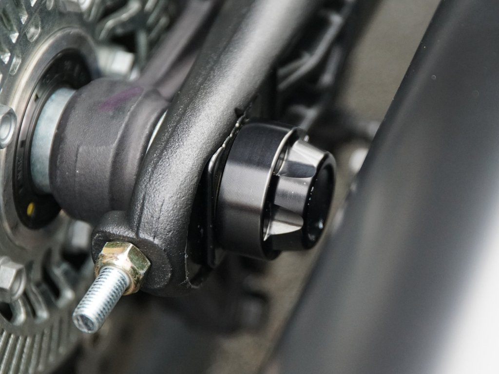 Dva tvarové kryty slúžia na zakrytie nevzhľadných originálnych matíc osky zadného kolesa. Pôvodné napínače reťaze sú navyše nahradené CNC frézovanou verziou s čiernou povrchovou úpravou. Na bočnej strane je sada pre vozidlá s našim držiakom ŠPZ aj bez neho.