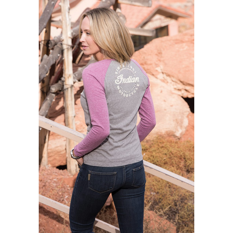 Ružové mramorové tričko s dlhými rukávmi a kontrastnými sivými mramorovými rukávmi. Logo Indian Motorcycle® je vytlačené  na chrbte, v starožitnej bielej vybíjanej tlači a malé v prednej časti hrudníka. 100% bavlna