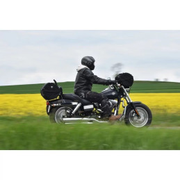 Taška v tvare valca s hlavným priestorom. Vynikajúca a praktická. Dostatočne veľká na uloženie veľkej fľaše s vodou alebo pršiplášťov. Ideálna na uloženie dvojitej alebo jednej tašky na prilbu. Umožňuje balenie alebo vybaľovanie tašky na prilbu bez jej demontáže z motocykla. Bočné otváranie. Taška je vystužená PCV - drží si tvar aj keď je prázdna....