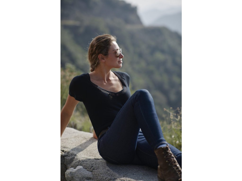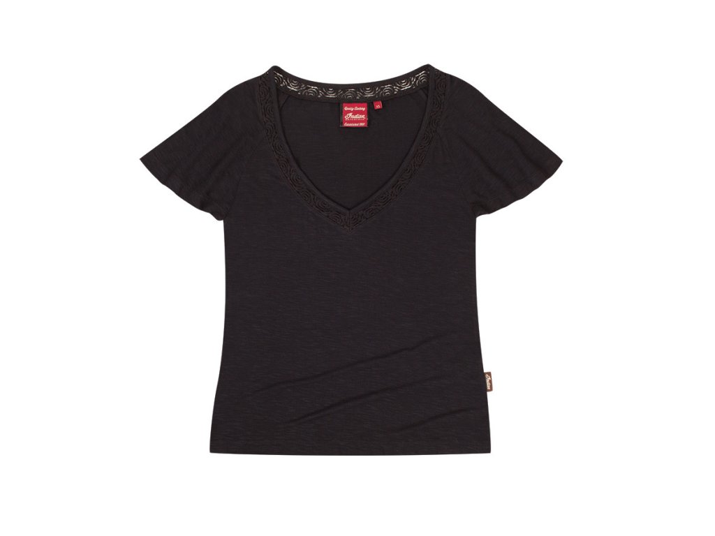 Jemné značkové raglánové tričko s hlbokým výstrihom do V, zakončené štýlovým čipkovaným lemom ktorý dodáva tričku eleganciu. 100% bavlna.